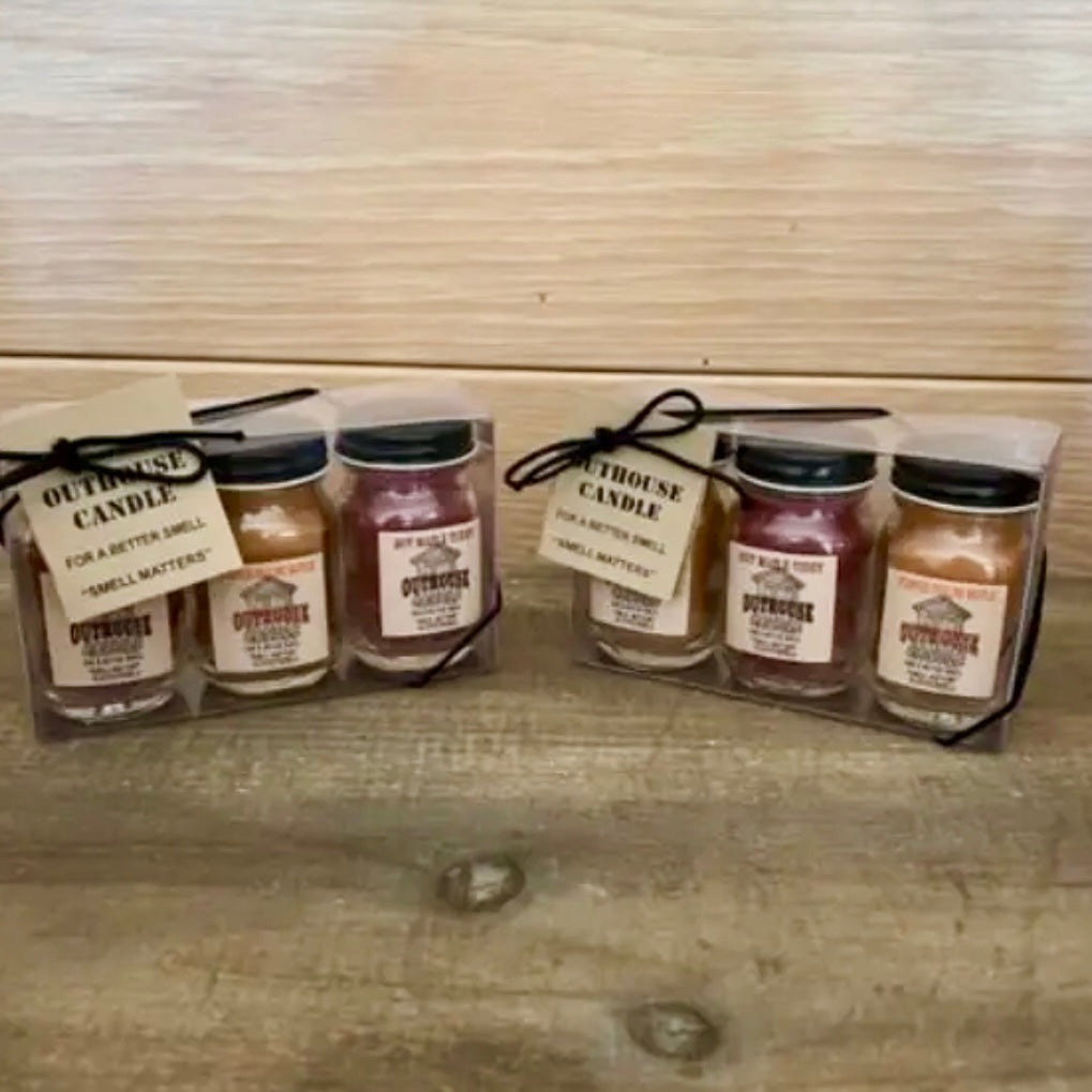 Outhouse Mini Candles 3 Gift Pack. Hot Maple Toddy and Pumpkin Praline. There are 6 to a case. Outhouse Candles for all Outhouses and the Finer Indoor Tollets.