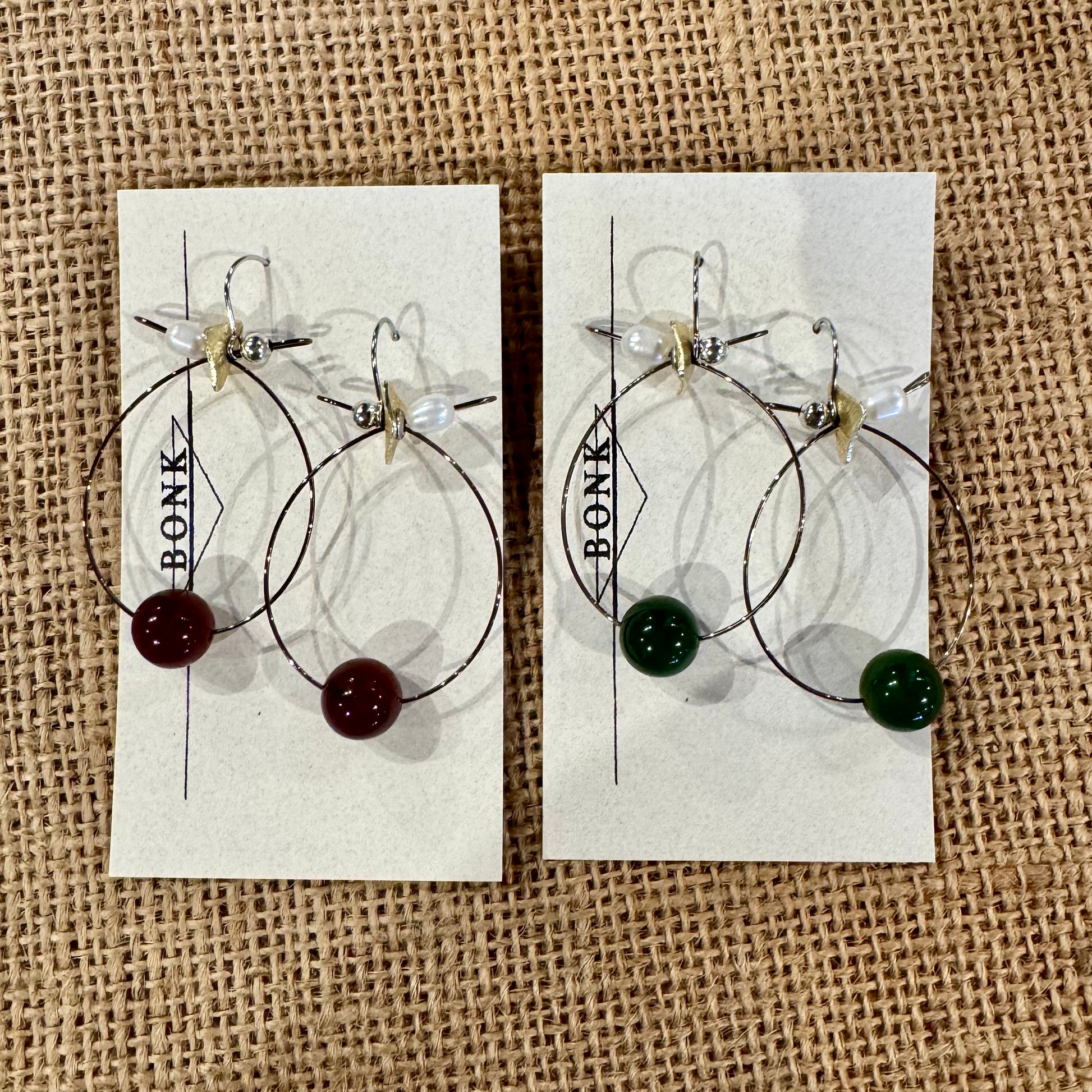 Handmade earrings by Sara Bonk. Designed and made in Georgia, USA. All earring hooks and wire are made with stainless steel and come with a rubber backing.