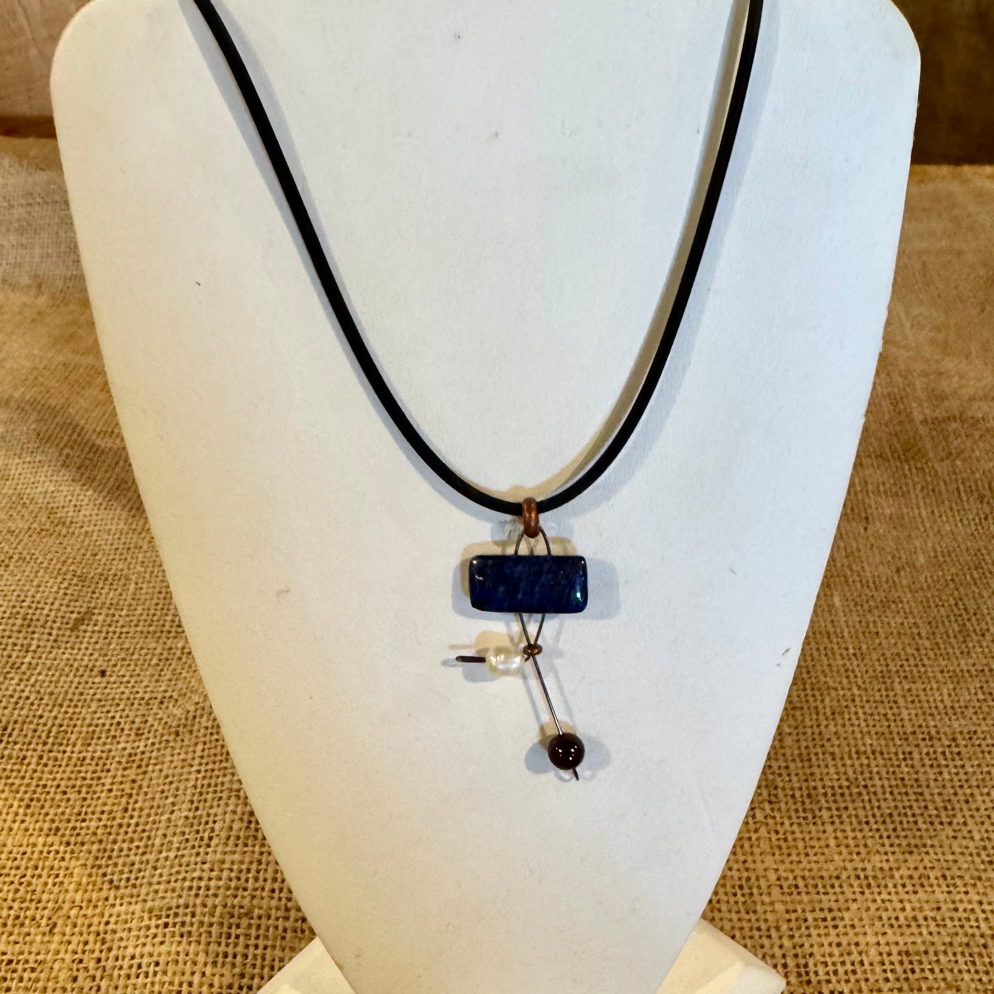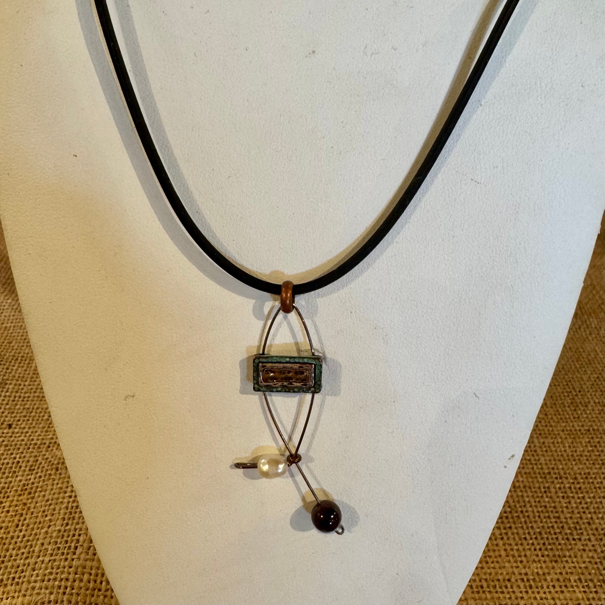 Handmade necklaces by Sara Bonk. Designed and made in Georgia, USA. The wire pendant is made with stainless and comes with a stretch black necklace cord.