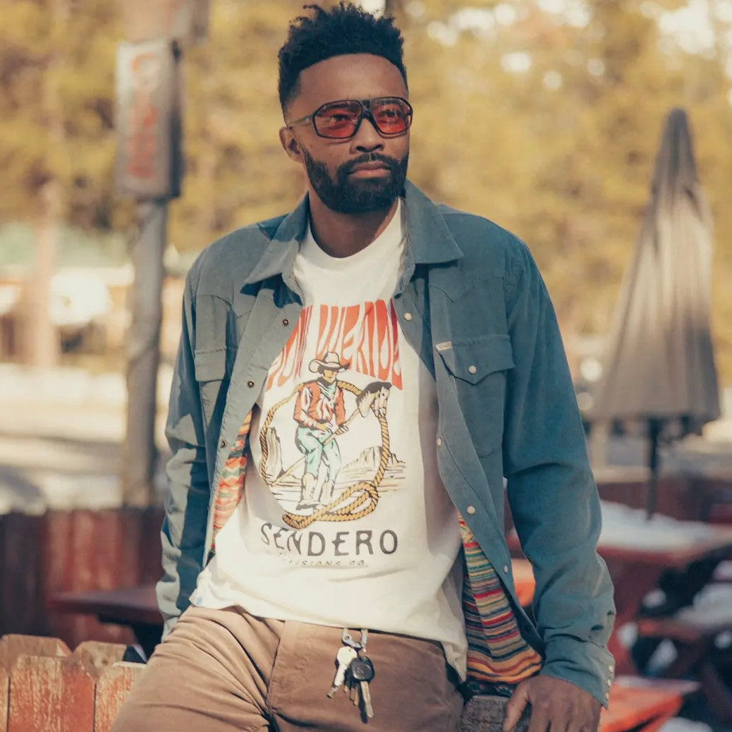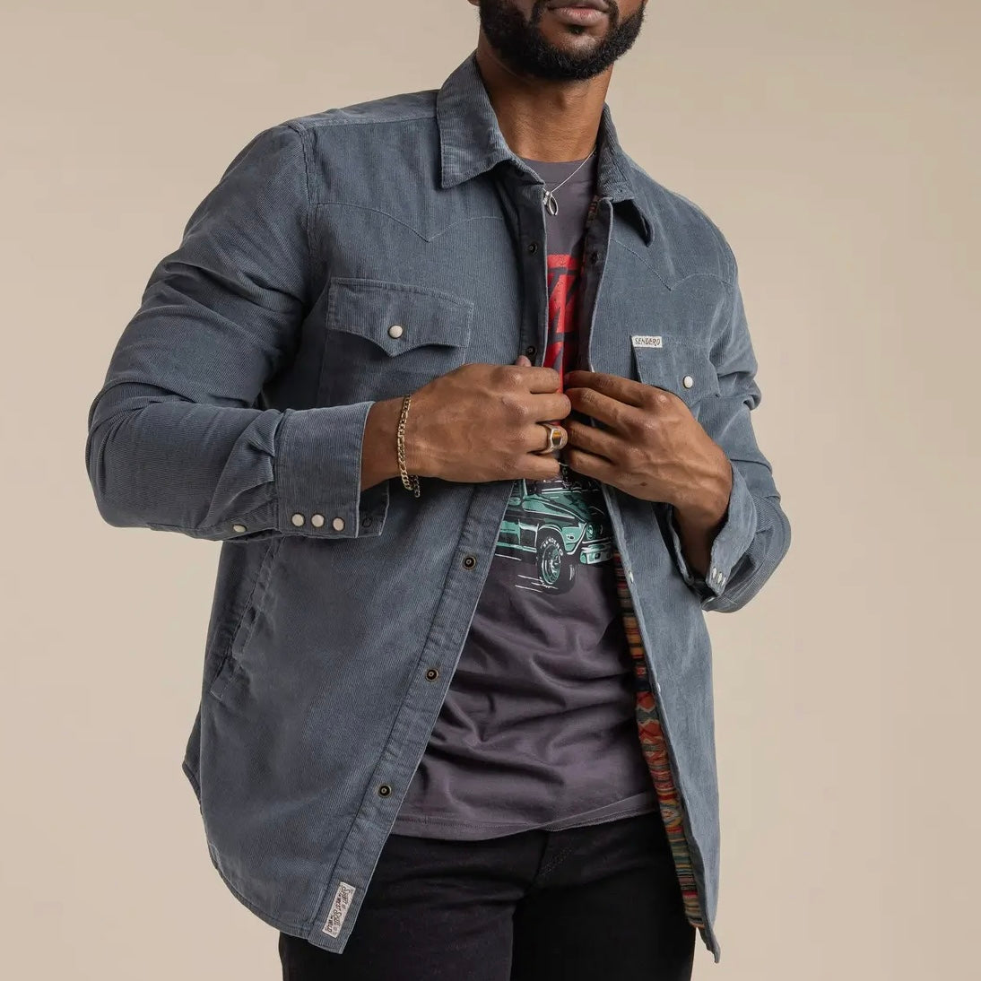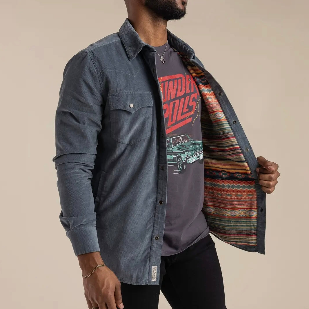 We’ve taken the layering game a level up this season, and are proud to introduce our cord shacket - the Desperado. The outer shell is an ultra soft corduroy, while the liner is a cotton flannel in contrasting colors and prints. Our camo shacket is lined with a warm gold colorway, while our solid shackets are lined with our latest Southwest Thunderbird flannel pattern.