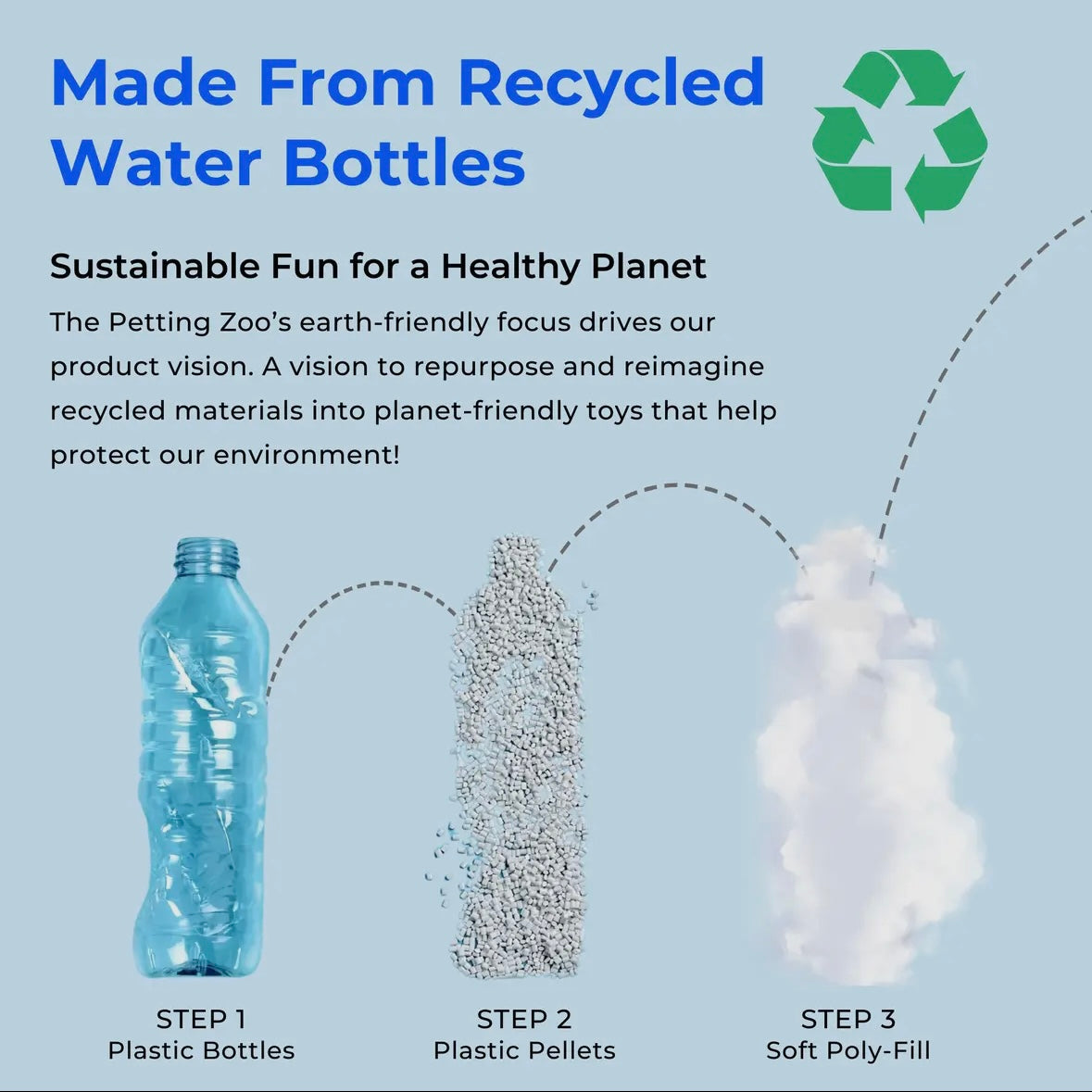 The Petting Zoo offers the highest quality wholesale plush, at the greatest value. Petting Zoo Plush is Recycled! Join our quest in preserving the environment, while bringing enjoyment to all ages with our collection of plush toys. Each one of our plush toys is made up of an average of 17, plastic water bottles. We care for the world we share...
