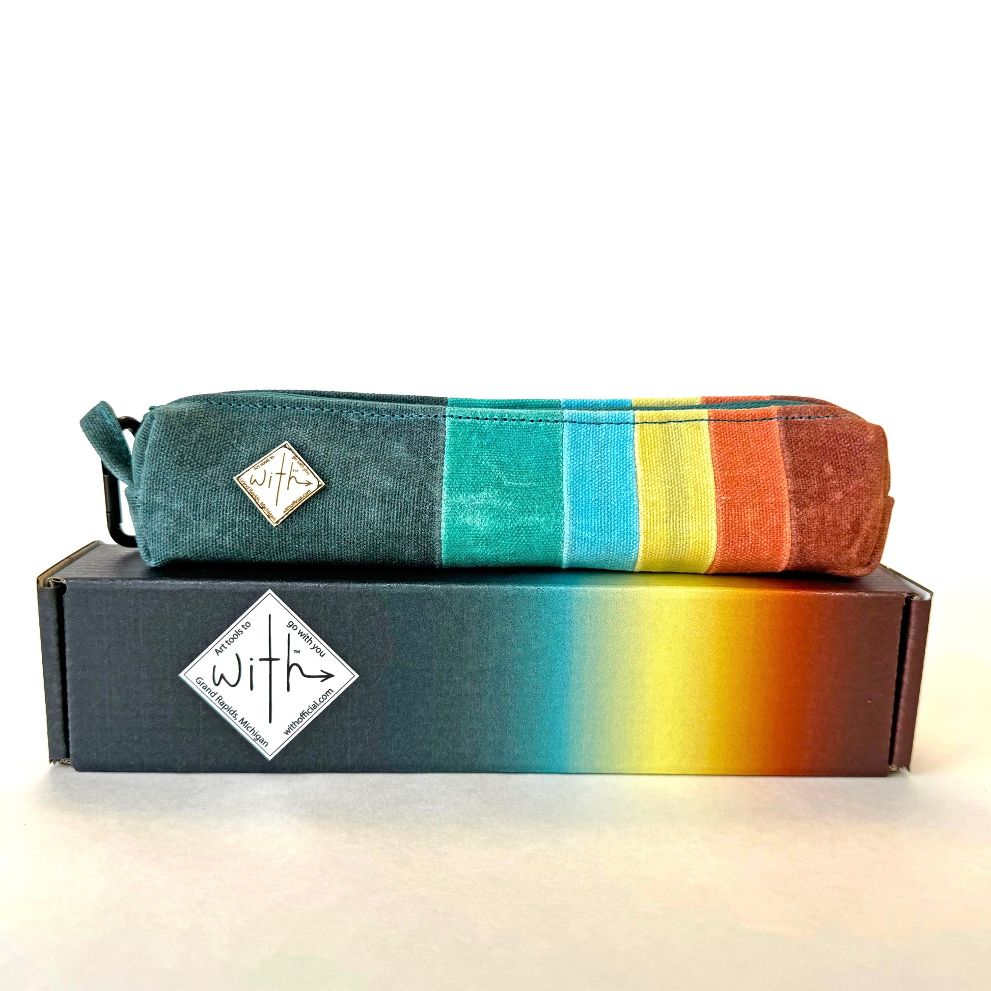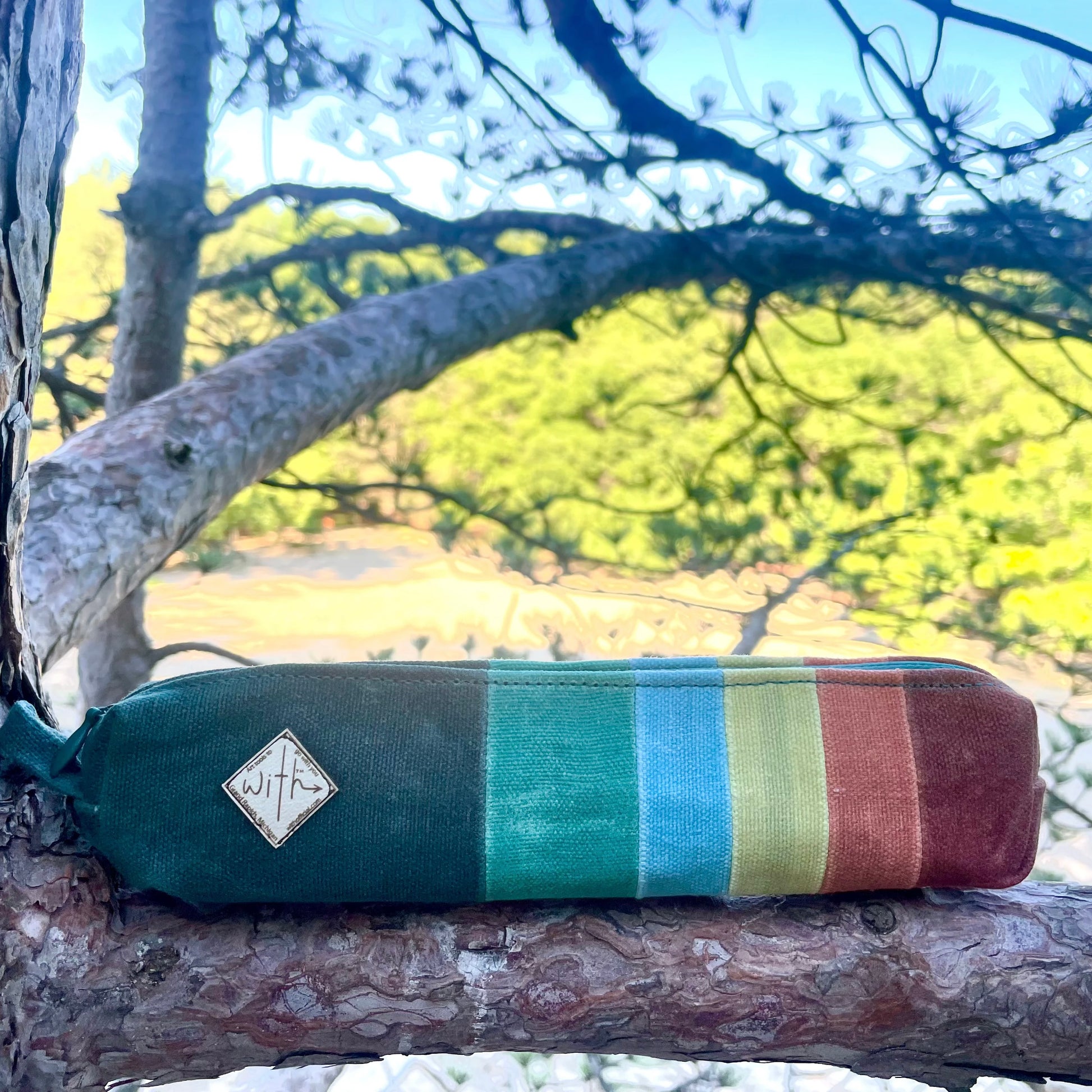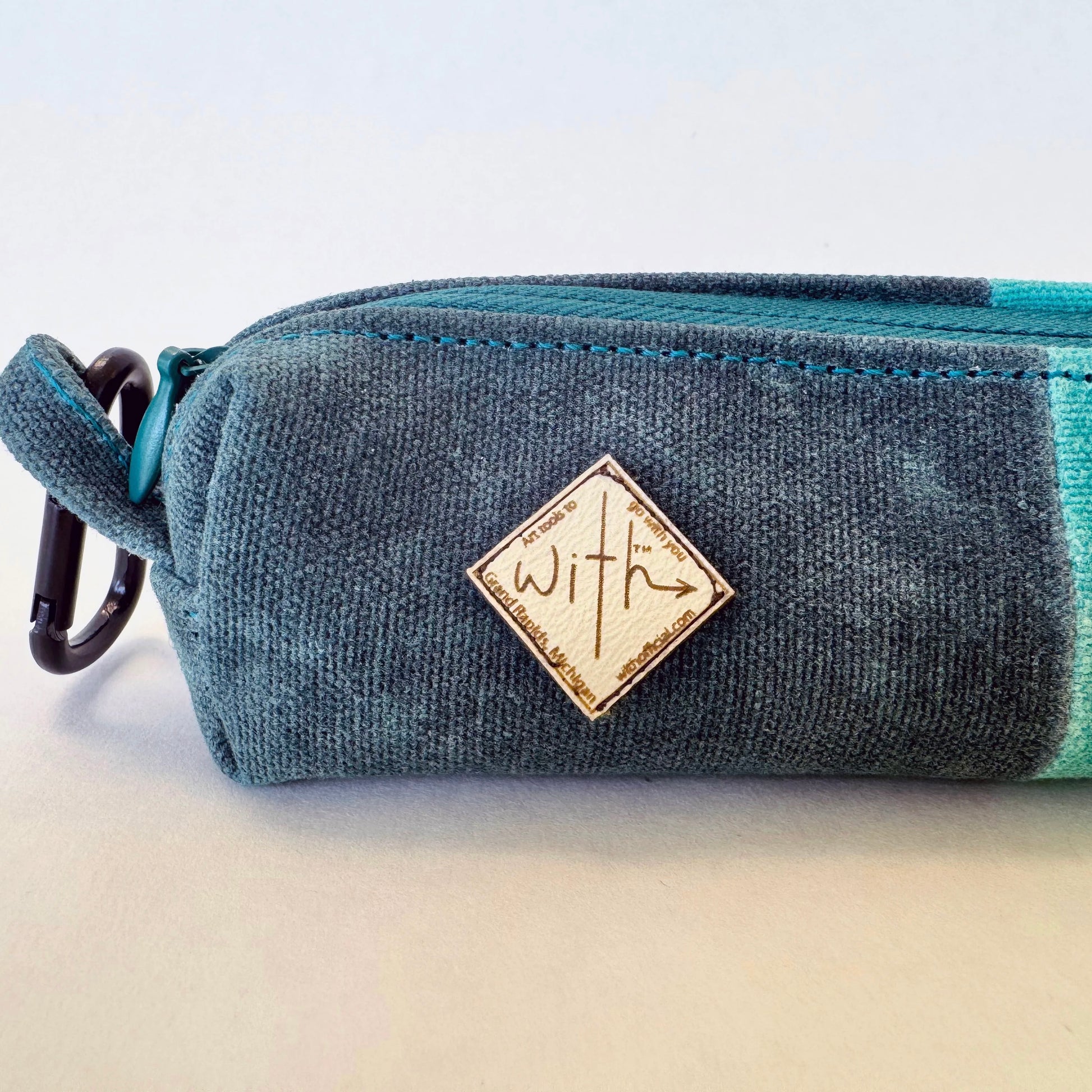 - Custom dyed, cut, sewn, and waxed canvas case with a liner, quad-stitched strap, and carabiner for easy carrying.
